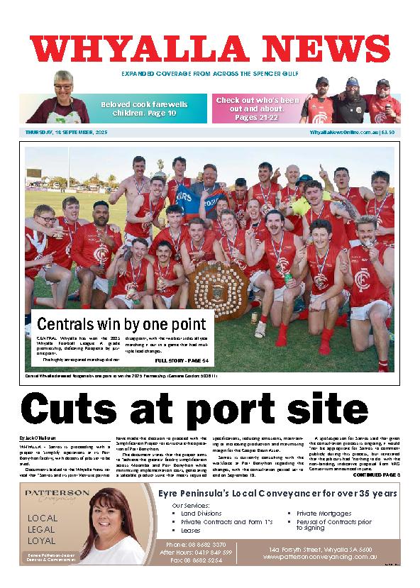 The Whyalla News – 18th September 2025 Subscribe or Login to see the rest of the content. Username Password * Remember Me Forgot Password News Those Were The Days with Shaune Beaty 08/11/2025 Name: Shaune Beaty Town of residence: Whyalla Town of Birth: Whyalla, born 1959 Age: 66 Mother and Father: Brian and Jaqui Beaty Siblings: One brother and three... Melbourne Cup festivities 08/11/2025 There were plenty of 'horsing around' at Melbourne Cup events across the Spencer Gulf. MORE PHOTOS NEXT WEEK Hometown hero crowned best in Australia 07/11/2025 In front of a boisterous home crowd, Sam Bacon was crowned the Australian sports shearing champion, earning his maiden national title in a hotly...