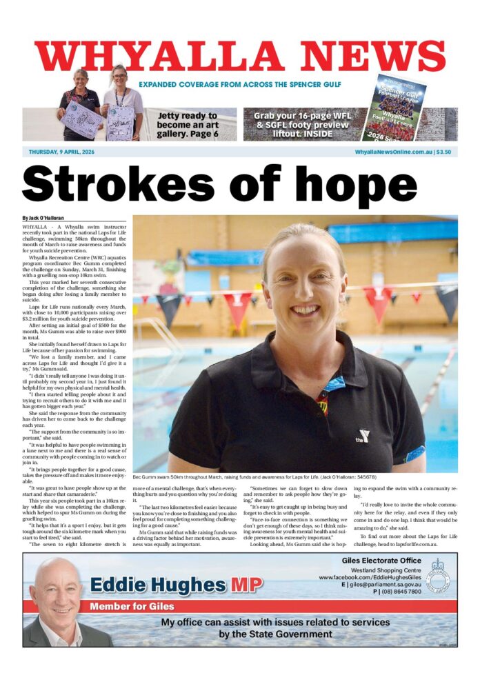 The Whyalla News – 9th April 2026 Subscribe or Login to see the rest of the content. Username Password * Remember Me Forgot Password News Swimming for a good cause 08/04/2026 WHYALLA - A Whyalla swim instructor recently took part in the national Laps for Life challenge, swimming 50km throughout the month of March to... Discover what’s on in the Spencer Gulf 08/04/2026 PORT PIRIE ON THE RUN MEMORIAL PARK RUN - Saturday, April 11, 8am, all welcome, register online before your first run. Free, weekly, timed 5k... Looking for a sea change? 08/04/2026 REGION - The Spencer Gulf Cities (SGC) Common Purpose Group has unveiled a new-look campaign aimed at promoting the region as an idyllic option...