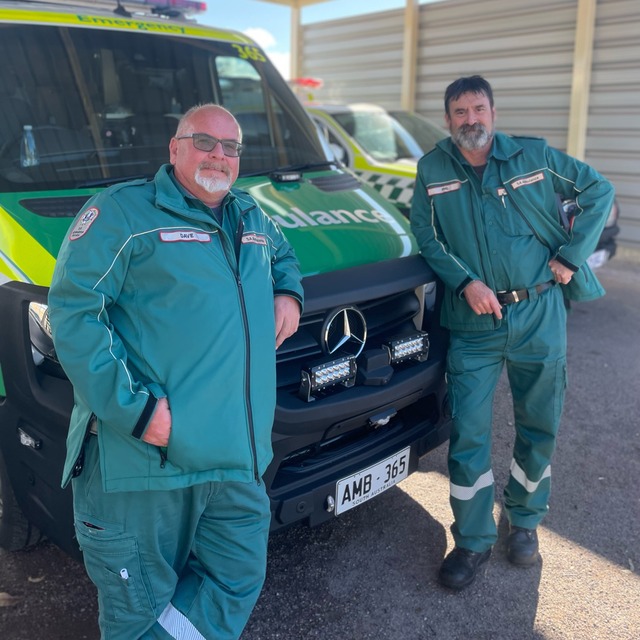 RMTS team members David and Philip play a vital role in transferring patients between hospitals, ensuring patients are safe and receive the clinical care they need on their journey. (SA Ambulance Service).