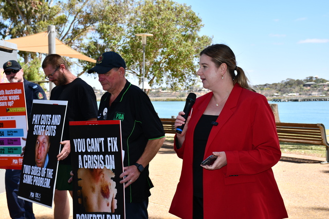 Recently elected Public Service Association general secretary Charlotte Watson making a speech to the large crowd of protesters who gathered down at the East side foreshore in Port Augusta on Thursday. (Lachlan Smith)