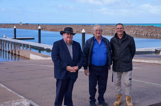 Dredging of the Whyalla Marin began on Monday November 10. Pictured is Mayor Phill Stone, Sea Rescue Peter Olivier and Dock Demolition Project Manager Anthony Bray. (Supplied).