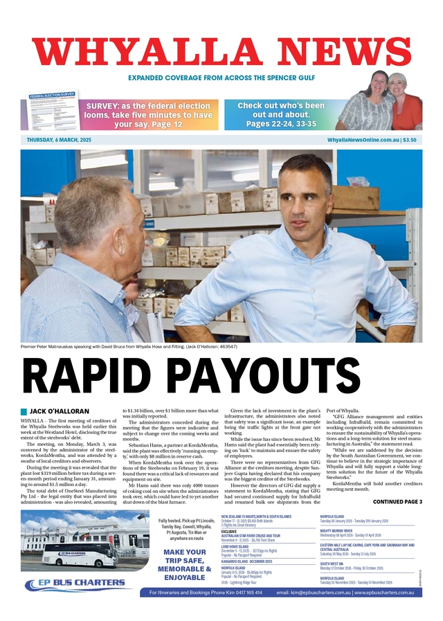 News Year that was in Whyalla – March 24/12/2025 FacebookTwitterEmail Purchase this photo from Pic Store: 525589 Jack O'Halloran MARCH 06/03/2025: The first meeting of creditors of the Whyalla Steelworks was held and convened by administrators KordaMentha. The total […] Subscribe or Login to see the rest of the content. Username Password * Remember Me Forgot Password